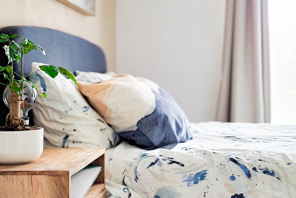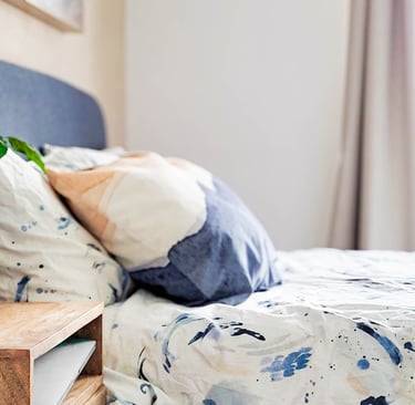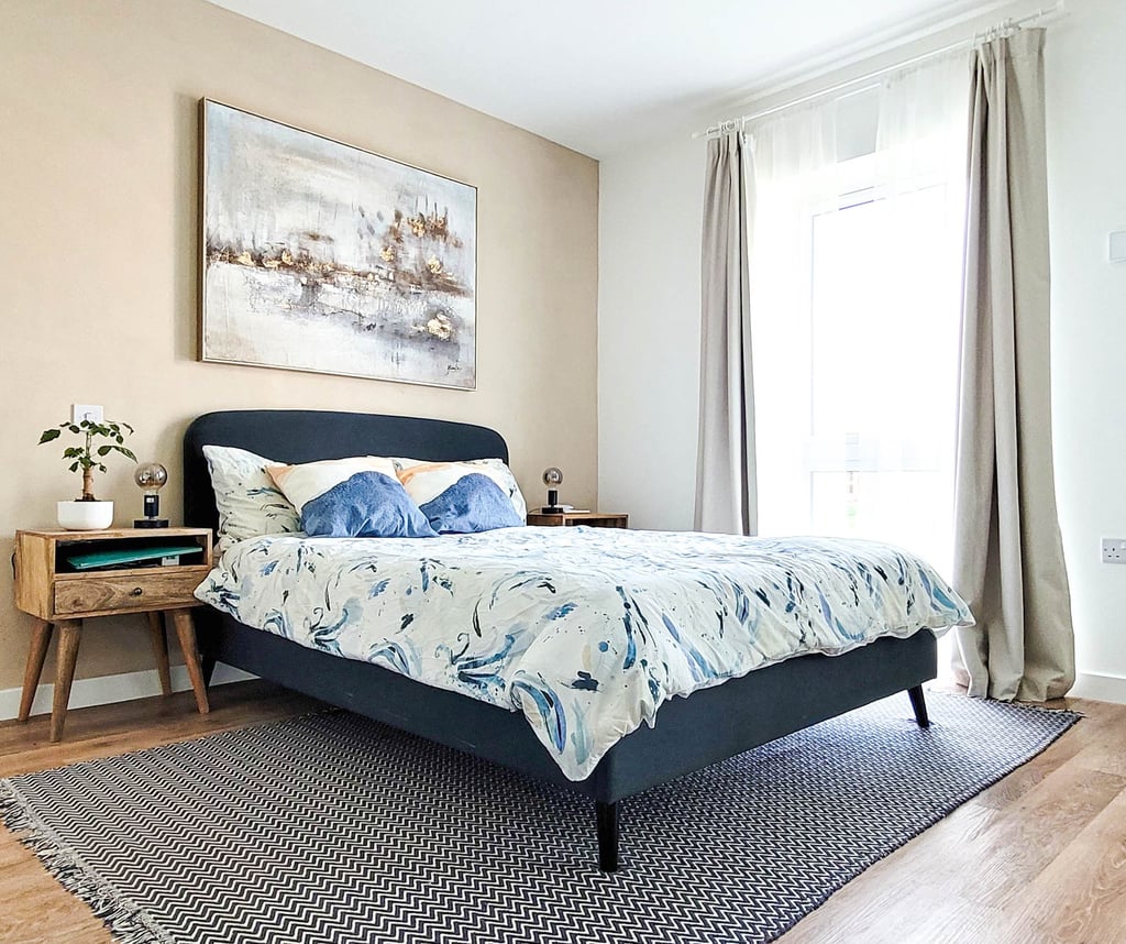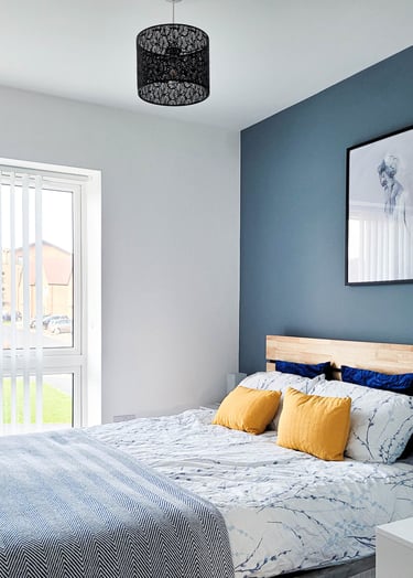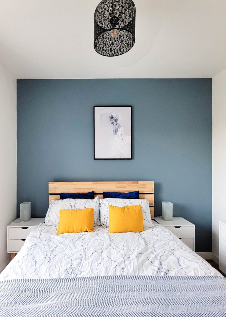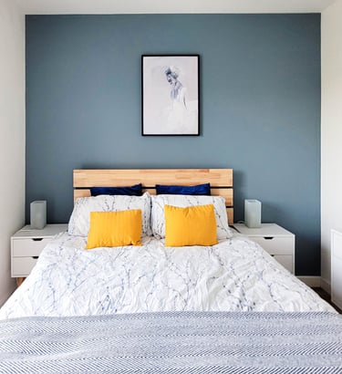 The guest bedroom offers a simple yet inviting atmosphere. Here, we followed the same principle of blue and beige, but in the opposite combination. The accent blue wall adds character, and the wooden bed frame creates warmth. The space is suitable for both short stays and longer visits.