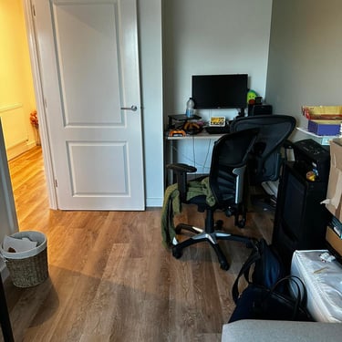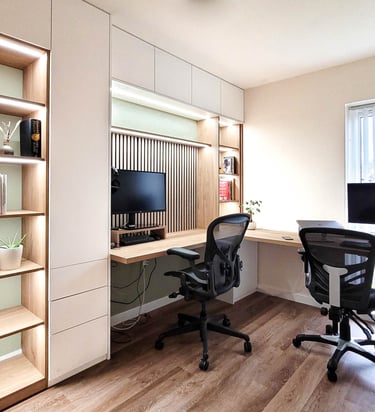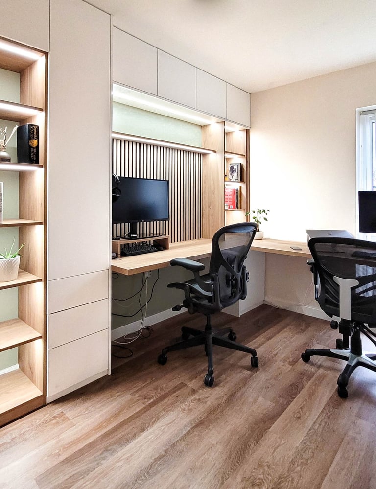 Prior to the redesign, the home office was a dark and cramped space, with the young family expressing a need for more storage solutions. After our transformation, the office became spacious and well-lit. The furniture manufacturing was entrusted to the carpenters from company D.A. Greenwood in London, who executed the order impeccably and down to the last detail. We added a large L-shaped desk and additional storage, which allows both owners to work efficiently. The revitalized office not only caters to their practical requirements for productivity but also fosters a welcoming and inspiring environment. The clients expressed that this room has undergone the most dramatic transformation – evolving from the least desirable space in their home to their absolute favorite!