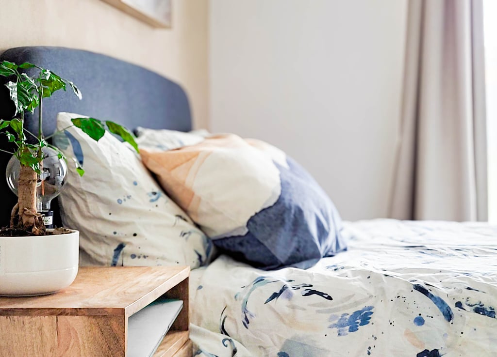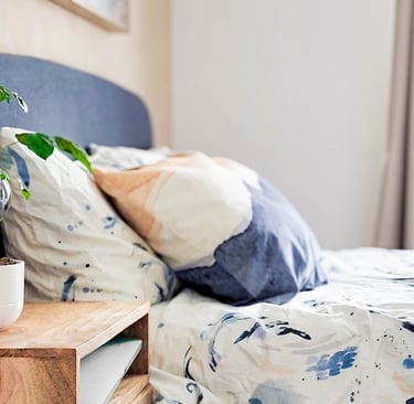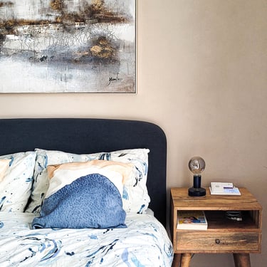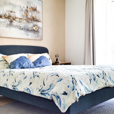 Родителската спалня следва концепцията с естествени материали и тъмносини детайли. Тъмносиният цвят, освен че визуално подчертава пространството, създава атмосфера на релакс и спокойствие – идеална за почивка. В съчетание с естествени материали и по-светли тонове, тъмно синьото добавя дълбочина и контраст, като придава изисканост и баланс на пространството. Интегрирахме елегантна тоалетка, проектирана да отговори на нуждите на дамата.