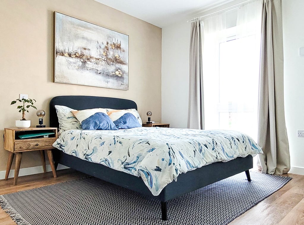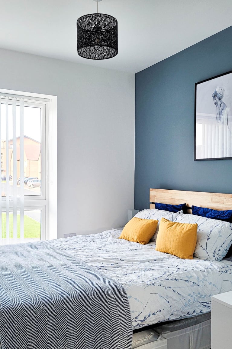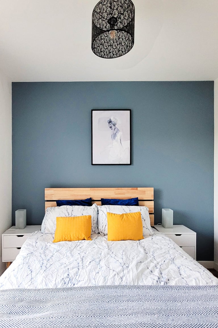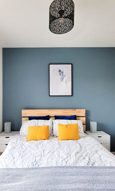 Гостната спалня е семпла и приветлива. Тук следваме същия принцип за синьо и бежаво, но в обратната комбинация. Акцентната синя стена добавя характер, а дървената рамка на леглото създава топлина. Пространството е подходящо, както за кратък престой, така и за по-дълги визити.