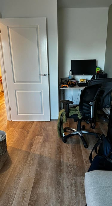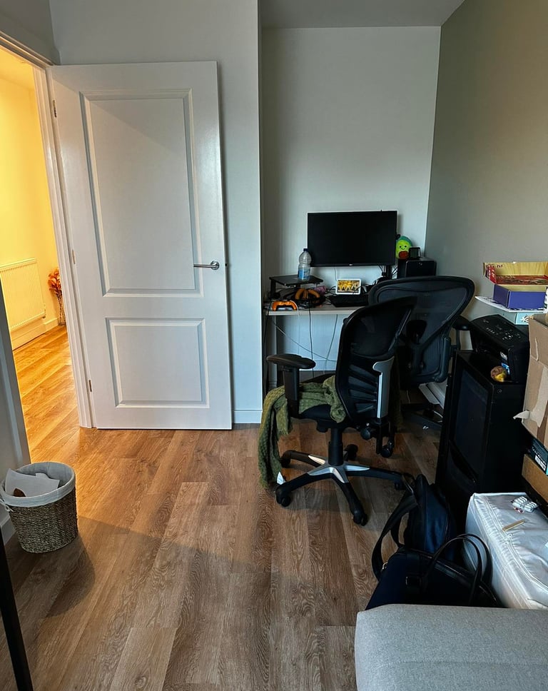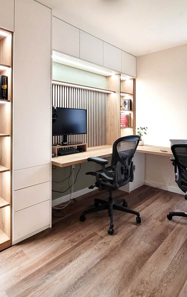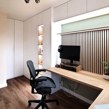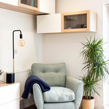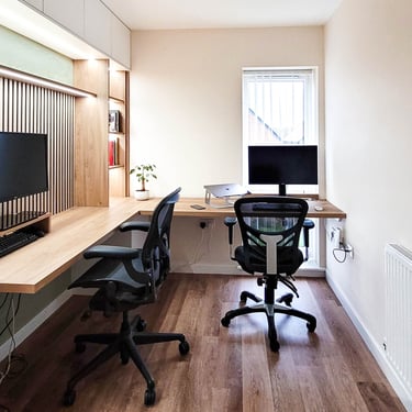 Преди преобразяването офисът беше тъмен и тесен, а младото семейство сподели, че нямат място за съхранение на вещите. След намесата ни офисът стана просторен и добре осветен. Изработката на мебелите бе поверена на меблистите от компания D. A. Greenwood в Лондон, която изпълни поръчката безупречно и до последния детайл. Добавихме голем Г-образно бюро и допълнително съхранение, които позволяват и на двамата собственици да работят ефективно. Офисът не само отговаря на нуждите им за продуктивност, но и създава приятна и вдъхновяваща атмосфера. Клиентите споделиха, че именно тази стая е претърпяла най-голяма трансформация - от най-неприятната стая в дома им е станала любимата!