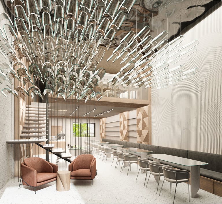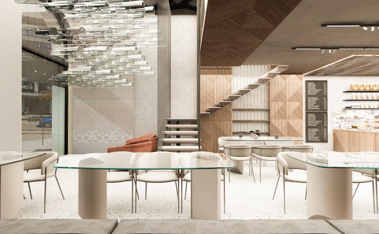 Проектът на това софийско кафене съчетава традиционните български елементи с модерния дизайн, създавайки уникално пространство. Първото, което привлича вниманието на посетителите, е таванът с двойна височина, подчертан от серия от персонализирани осветителни тела. Те са вдъхновени от традиционните български керемидени покриви, но през съвременен прочит.