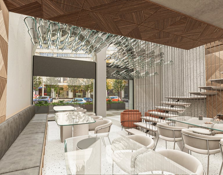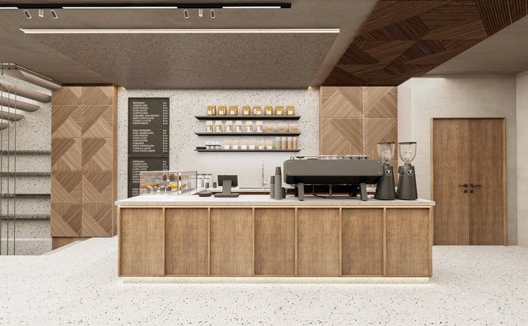 Интериорът обединява старото и новото чрез елементи като дървени панели и модерни седалки. Тези детайли умело препращат към българското майсторство, но чрез новаторски и минималистичен дизайн. Дървената пейка, със своите изчистени линии и съвременни акценти, е символ на връзката между миналото и настоящето. Тези елементи създават усещане за уют и динамика, а пространството предлага на посетителите не само комфорт, но и връзка с миналото. Това кафене не е просто място за почивка, а е своеобразно съвременно преживяване, което съчетава традиция и модернизъм в перфектен баланс.