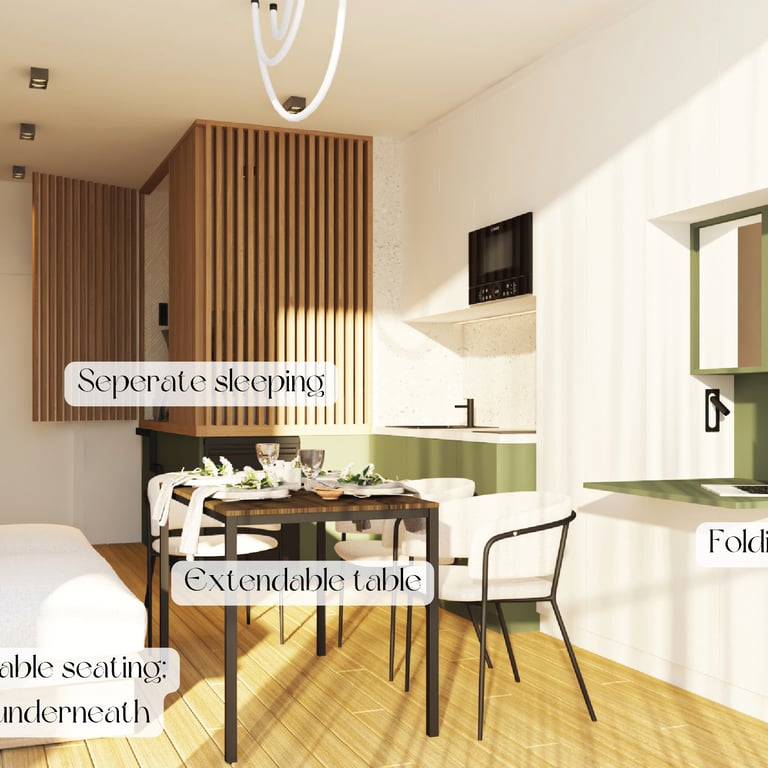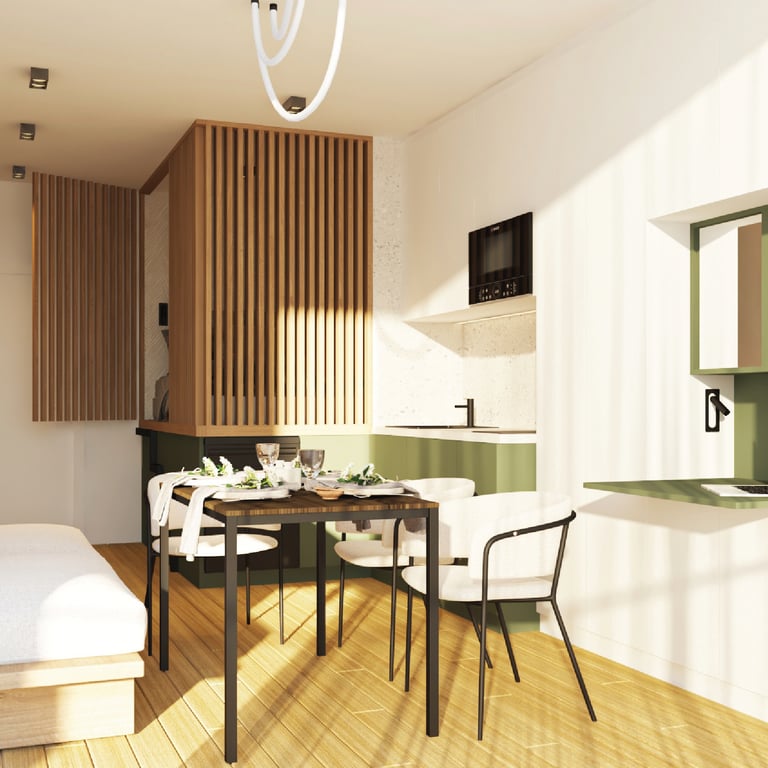 Проектът в Семково, България успешно се справя с предизвикателството да създаде иновативна стая в новият комплекс за съвметсно живеене “Co-living Semkovo”. Сградата е разположена в горска среда, като дизайнът използва естествени материали и текстури, които създават връзка с природата за гостите. Трансформиращите се мебели осигуряват гъвкавост на пространството, което лесно се адаптира за работа, социални събития или почивка.